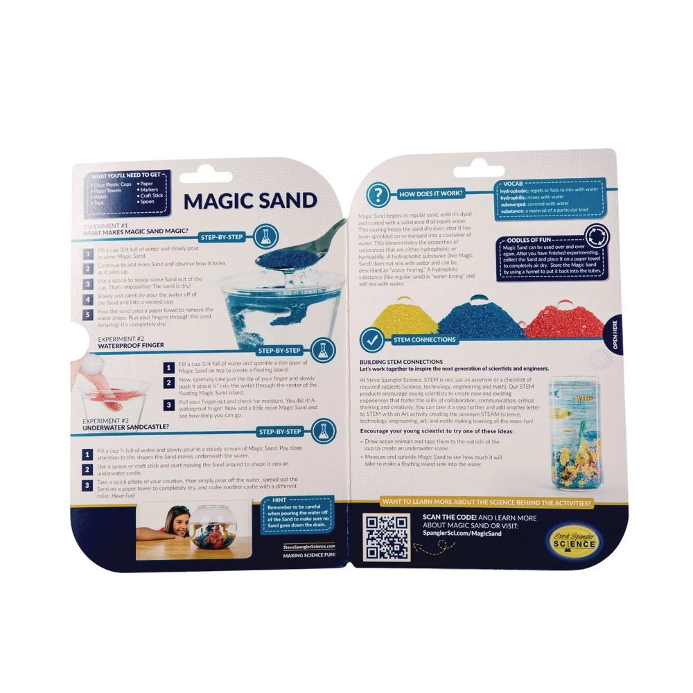 Steve Spangler’s Magic Sand is a hydrophobic polymer; sand that never gets wet! It can be used to build underwater sandcastles! Also, Magic Sand is a reusable science toy! When finished, simply pour the water off and let the sand dry! You can use it for science experiments again and again!