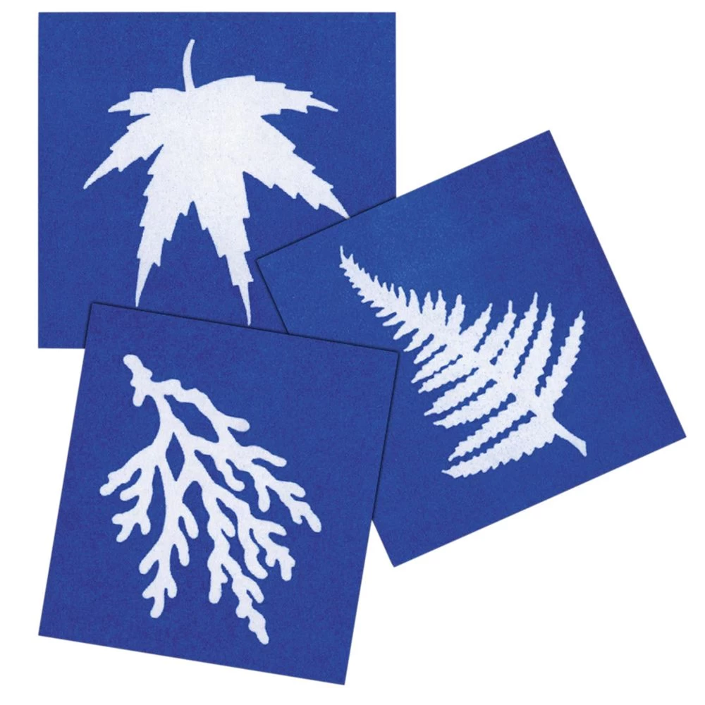 The nature print paper is coated with light-sensitive chemicals, which react to light waves and particles when exposed to light. When you place objects on the paper, they block the light and turn white while the paper around them remains blue. Water stops the process and fixes your images on the paper.