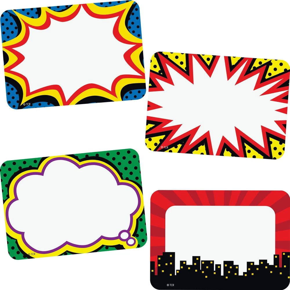 These labels in a fun comic-book art style have an extra large writing area. Ideal for use as name tags and gift tags, they also make great labels for cubbies, folders, bins, and more.