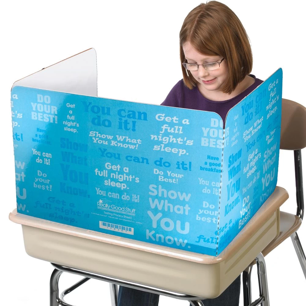 Keep eyes from wandering, eliminate distractions and help ensure focus and concentration on a daily basis with Glossy Privacy Shields from Really Good Stuff. Our attractive and functional Privacy Shields are made of sturdy corrugated cardboard with a bright white interior.Printed with motivational messages glossy blue pattern. These privacy shields for desks are ideal for both pencil-and-paper and computer-based testing (including PARCC and other standardized tests). The large privacy shields are bigger and taller for extra privacy. The sides are high enough to help students avoid distraction, but low enough for you to easily monitor students’ work. They’re great for everyday use in classrooms, computer labs, or at home to create a barrier. Students love setting up “offices” with them too!Designed to fit standard desks, Really Good Stuff three-panel glossy privacy dividers have a 22″ x 14″ center panel and the two side panels are 16″ x 14″ each. This privacy shield folds up into thirds for easy storage. It’s durable enough to withstand daily use on students’ desks and tabletops. These Privacy Shields will create a barrier to keep your students focused year after year.*STYLISH AND USEFUL: Includes (12) three-panel sturdy corrugated cardboard large privacy shield with a bright white interior. They are printed with encouraging motivational messages in a calming blue pattern. The center panel is 22″ x 14″ and the two side panels are 16″ x 14″ each.*HELP STUDENTS FOCUS: These large privacy shields are a must-have for teachers and parents because they help eliminate distractions in the classroom or at home.*CREATE A WORK STATION BARRIER: Large Privacy Shields are bigger and taller for extra privacy. The sides are high enough to help students focus, but low enough for you to easily monitor students work. Students feel like they have their own work station.*DURABLE AND EASY TO STORE: Our privacy shields are built to last. Made with sturdy corrugated cardboard to withstand daily use on students’ desks and tabletops. Folds up into thirds for easy storage. Really Good Stuff’s Privacy Shields are built to last year after year.*ECONOMICAL: These are a low-cost, long-term option that can be used in any classroom or home year after year.