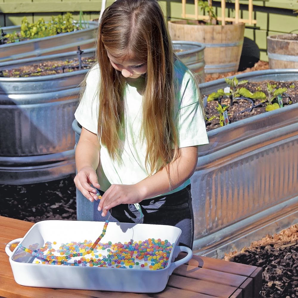 We can’t see ultraviolet rays, but kids learn they’re there with these special beads. Make bracelets or necklaces while the beads are white, and then wear them outside. The ultraviolet-sensitive pigment changes the beads from white to the assorted colors of blue, green, orange, purple, red, and yellow, even on a cloudy day! Your young scientists will learn that UV light is all around them, even when they can’t see it. Bring the beads inside and they will revert back to white since they are no longer exposed to UV rays. The beads will change over and over again without fading.