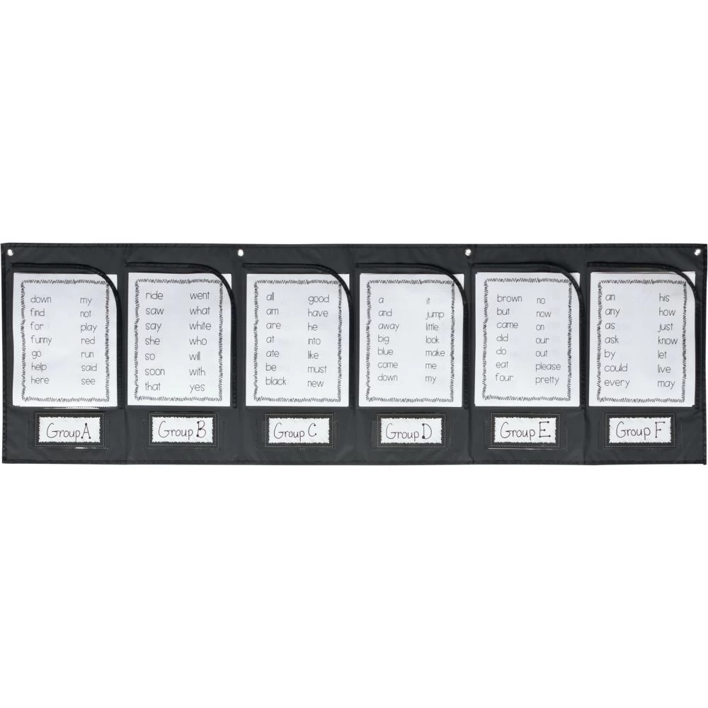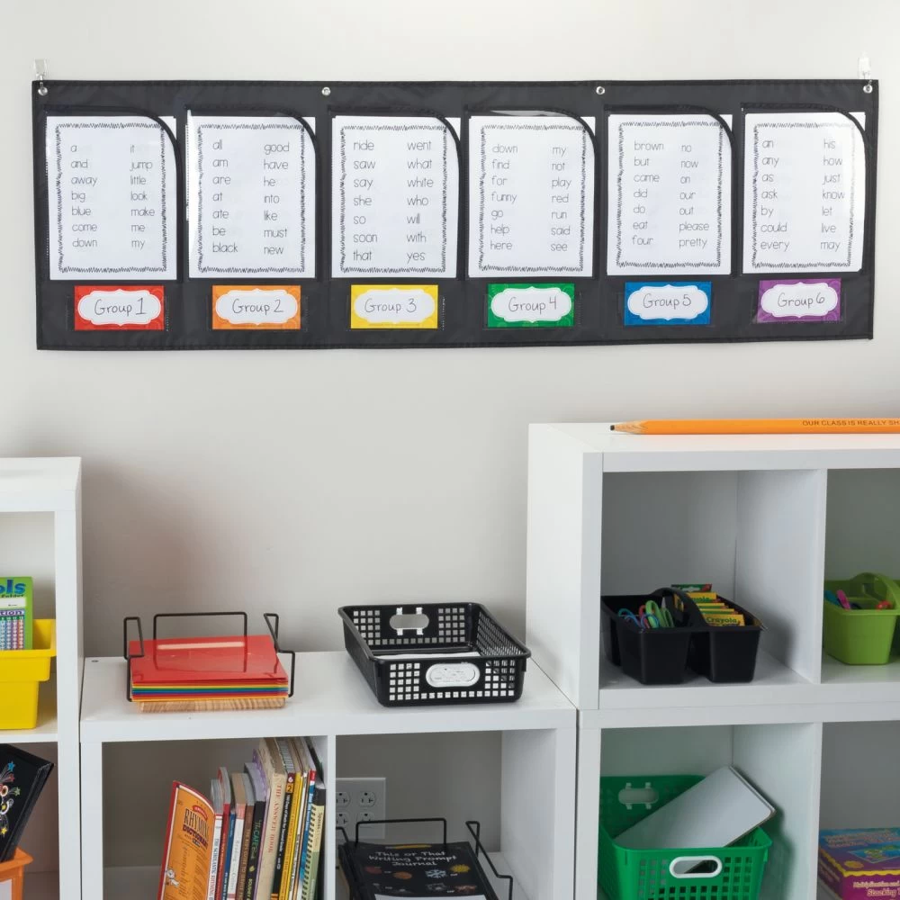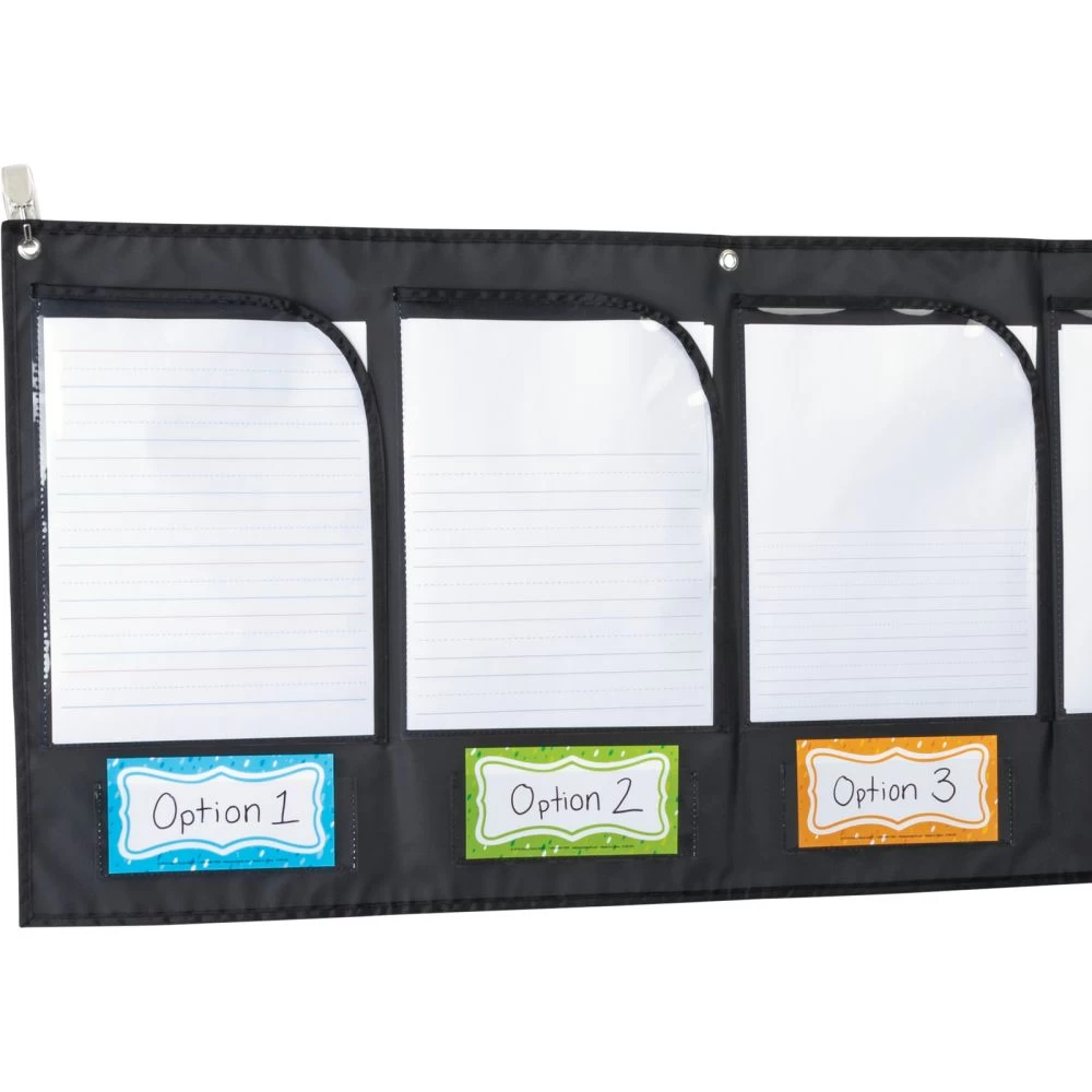 Use this brand-new pocket chart format to easily collect homework, or for a variety of other grouping activities. The sturdy chart has six pockets large enough to hold 8″ x 11″ papers and smaller pockets underneath that can hold other materials. Twelve cards are included to label the pockets.*Collect Homework Easily: Track homework collection simply with this large pocket chart with good-sized pockets that are open on the top and right sides so students can slip their papers in. Easy-peasy!*Handy Organizational Tool: This pocket chart in a new format is a great organizational and classroom management tool you’ll find yourself using many times each week.*Useful Grouping Tool: In addition to being a great collection tool for homework, this sturdy pocket chart lets you collect or hand out papers for other grouping activites, such as lists for spelling groups or math activities.*Two Sizes Of Pockets, 4 Grommets: The top pockets on this chart are 9″ by 12″ and the smaller ones underneath are 7″ by 2″. They will hold a variety of papers and items. Four grommets at the top allow you to hang the chart securely.Organize your classroom and easily collect student homework with this wall pocket chart with labels.
