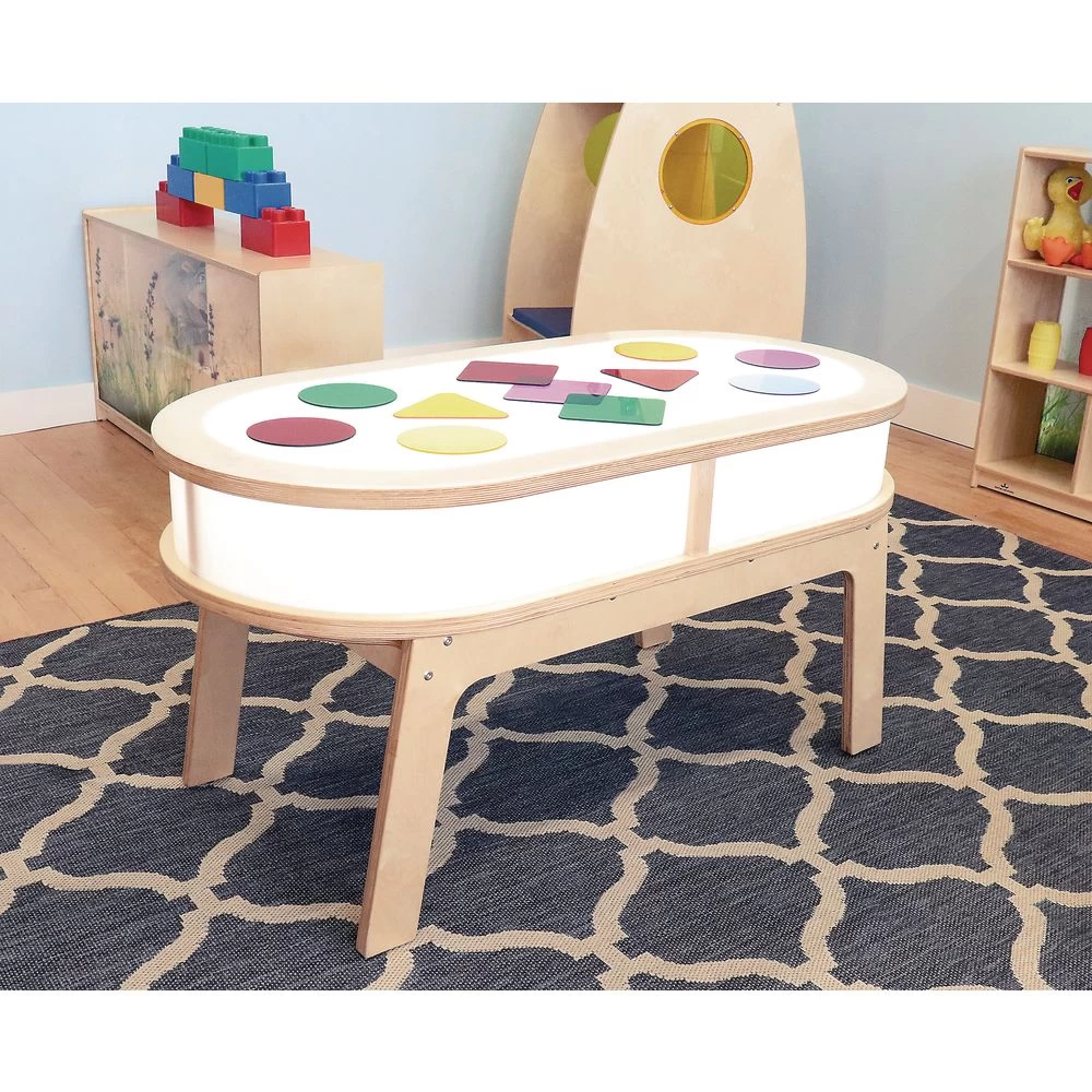 Not all light tables are created equal! You’ll love the pleasant, curved design, unique side light panels and extra sturdy construction of our Radiant LED Light Table that integrates seamlessly with all other pieces in our Whitney Plus collection. Thoughtful design touches include gracefully curved corners that are safer and provide more accessibility to the table surface; an elongated shape that enables more children to participate at the same time; legs that are fastened lengthwise for greater stability without impeding access to the table surface; and illuminated side panels that provide children a unique way to explore the intrinsic attributes of objects. The LED lighting system displays brighter and more uniformly distributed light, uses less electricity, produces less heat and includes a handy in-line on/off toggle switch. Leg levelers included.