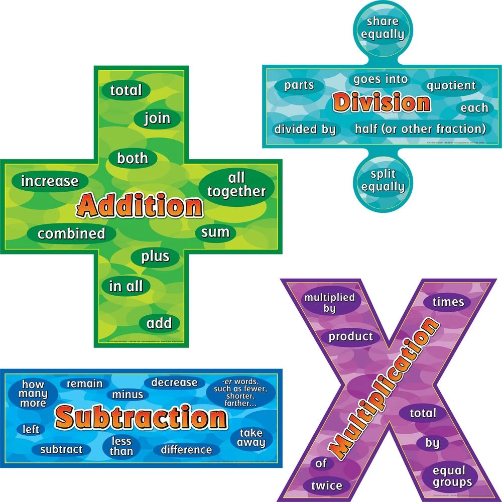 Support problem-solving skills by providing a colorful reference to keywords found in word problems. Each poster, in the shape of a different operation symbol, includes the words that prompt students to either add, subtract, multiply, or divide.