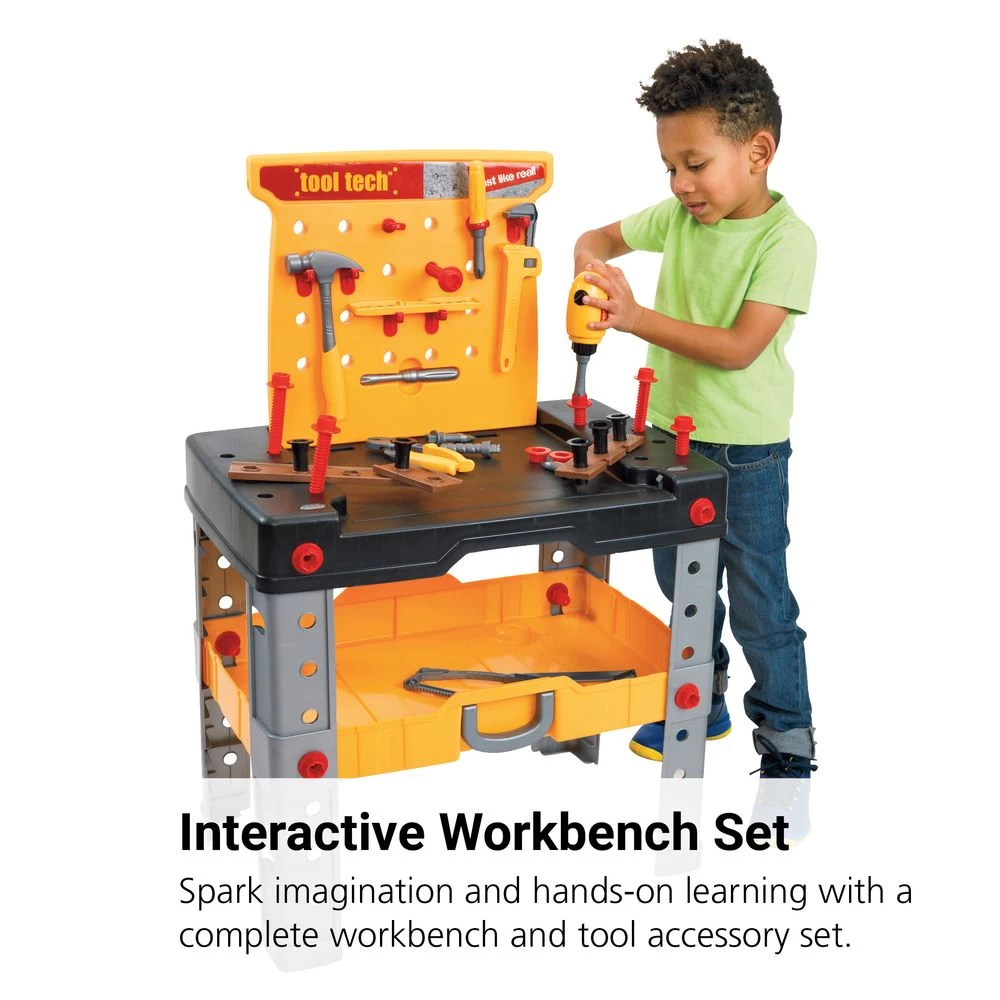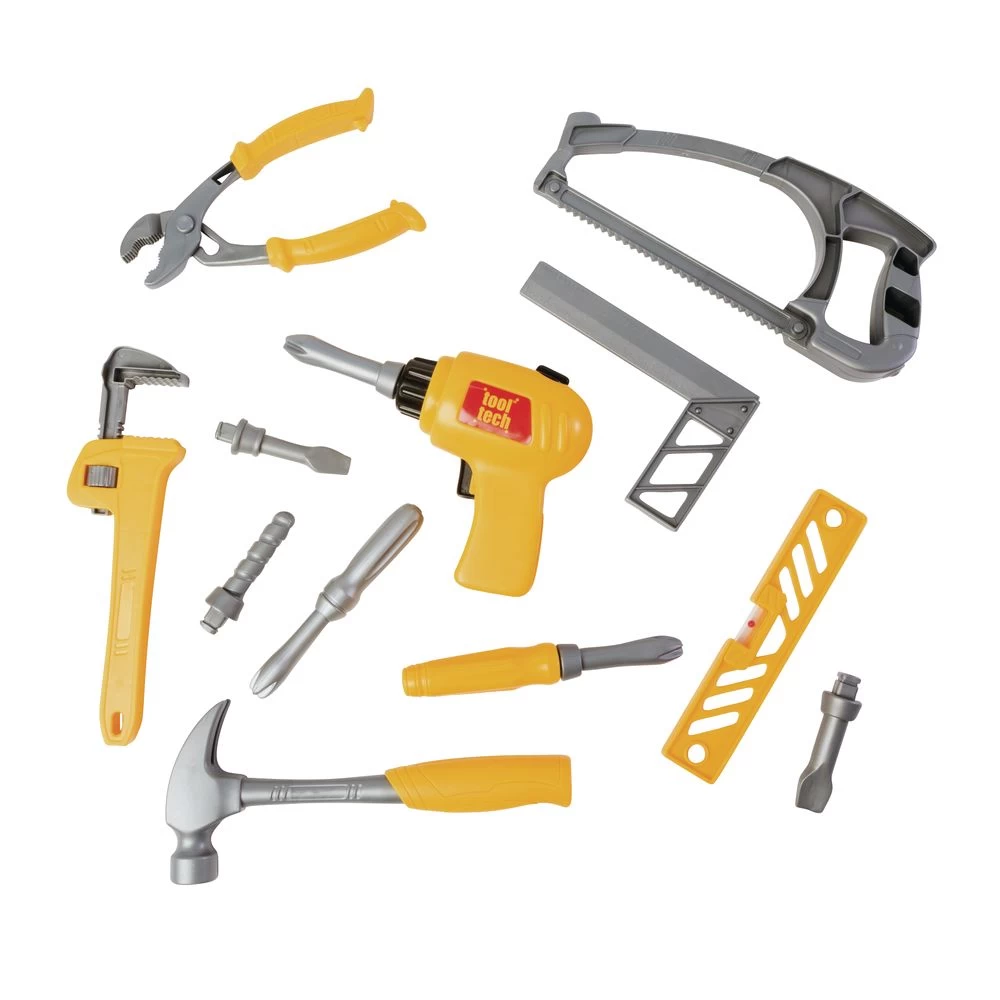 - SET INCLUDES: Workbench that folds into storage with a handle, power drill, hack saw,”wood” pieces, hammer, wrench, pliers, power screwdriver with exchangeable heads, level ruler, hand screwdriver, square ruler, hooks, holders, nails, bolts and nuts. Requires 1 “C” battery (not included).