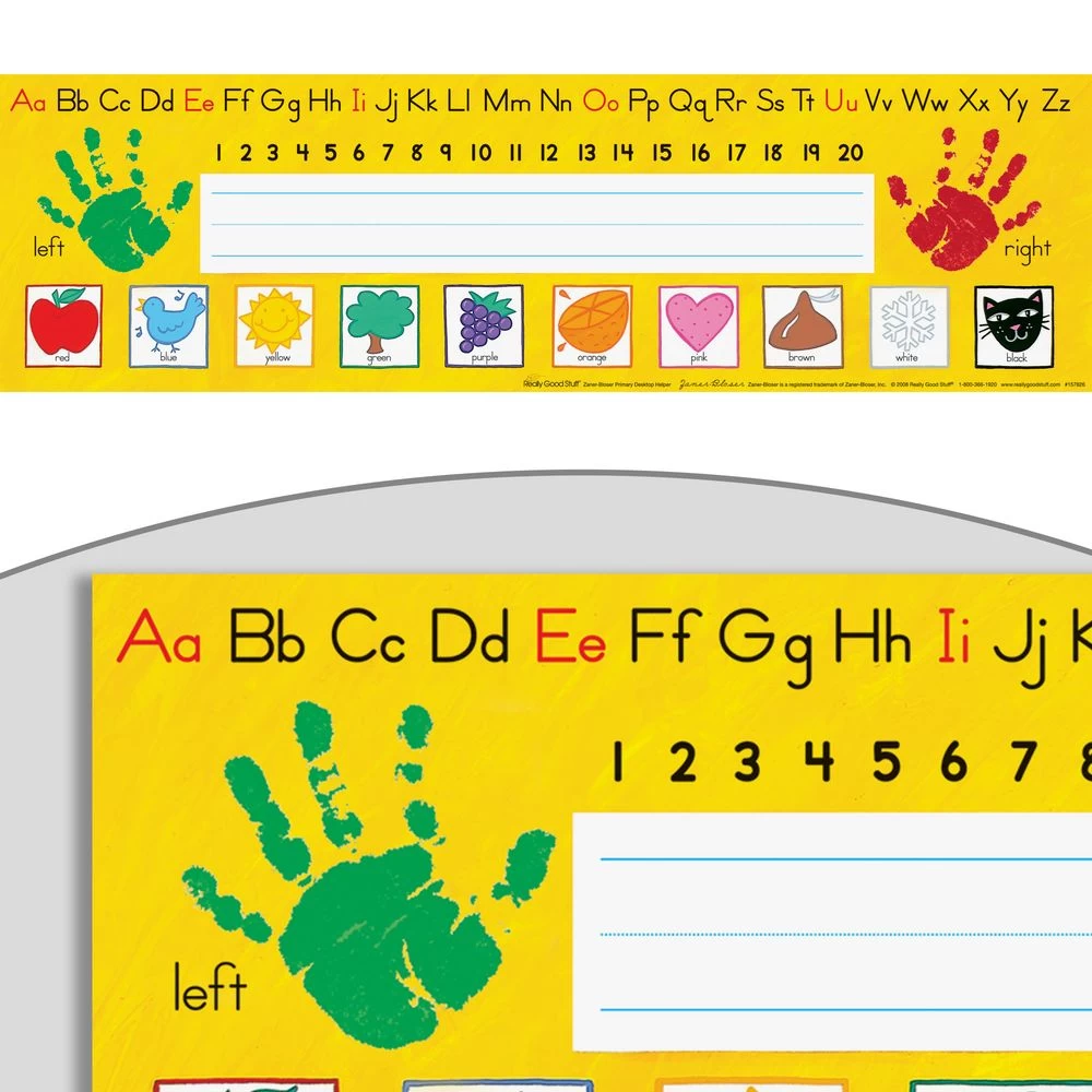 - VERSITILE LEARNING: More than a name plate, Really Good Stuff’s desktop helpers feature the Zaner Bloser alphabet, left and right handprints for direction, 0-20 number line, fun illustrations to reinforce color concepts and plenty of space for students to print their name.