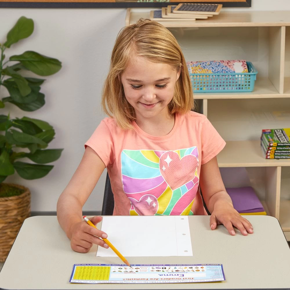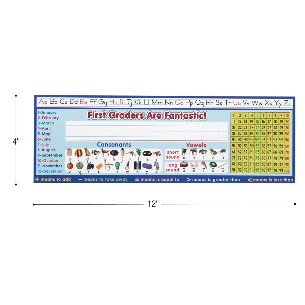 VERSITILE LEARNING: More than a name plate, Really Good Stuff’s desktop helpers feature valuable curricular concepts for the first grade-level. Standards-based information is provided on both sides of these Desktop Helpers including Zaner-Bloser alphabet, consonants and vowel, months of the year, 100 grid, ruler, reference materials that reinforce important concepts in math, language arts, and more, all while allowing plenty of space for students to print their name.