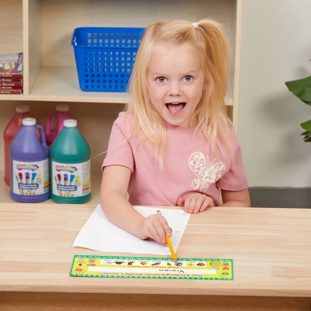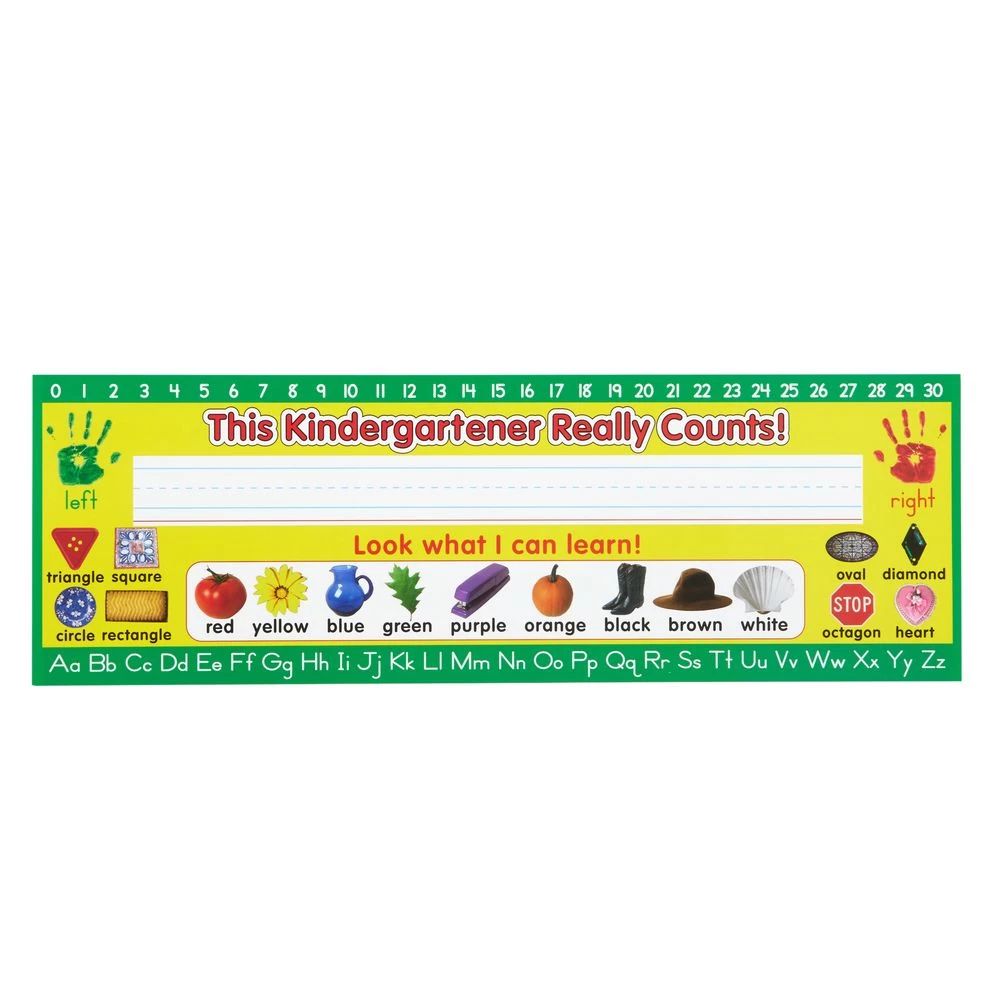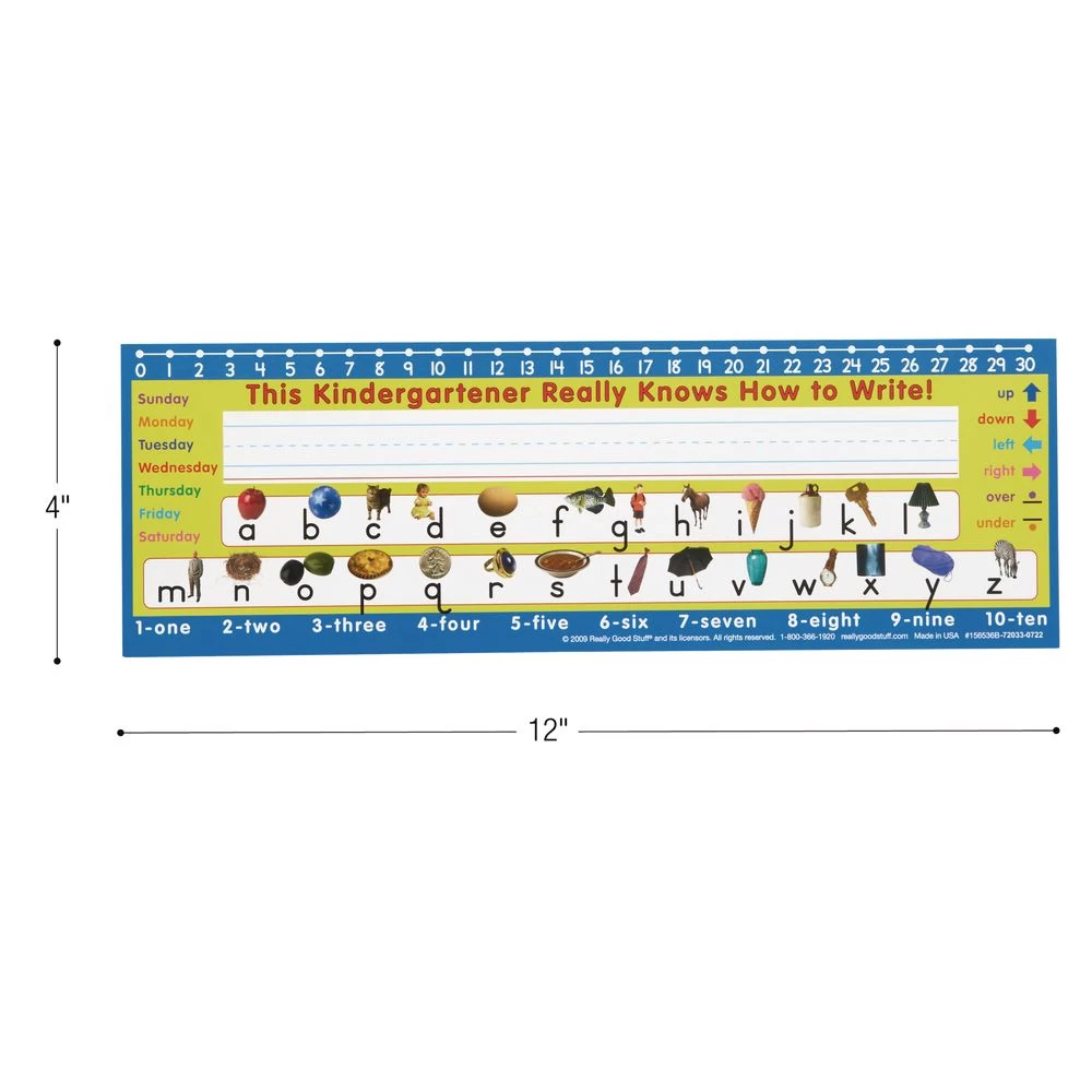 VERSITILE LEARNING: More than a name plate, Really Good Stuff’s desktop helpers feature valuable curricular concepts with standards-based information provided on both sides. One side has the Zaner-Bloser alphabet, 0-30 number line, left and right handprints for direction along with photographs and reference materials that reinforce colors and shapes. Flip the helper over for another 0-30 number line, days of the week along with photographs and reference materials for the alphabet and directions. Both sides allow plenty of space for students to print their name.